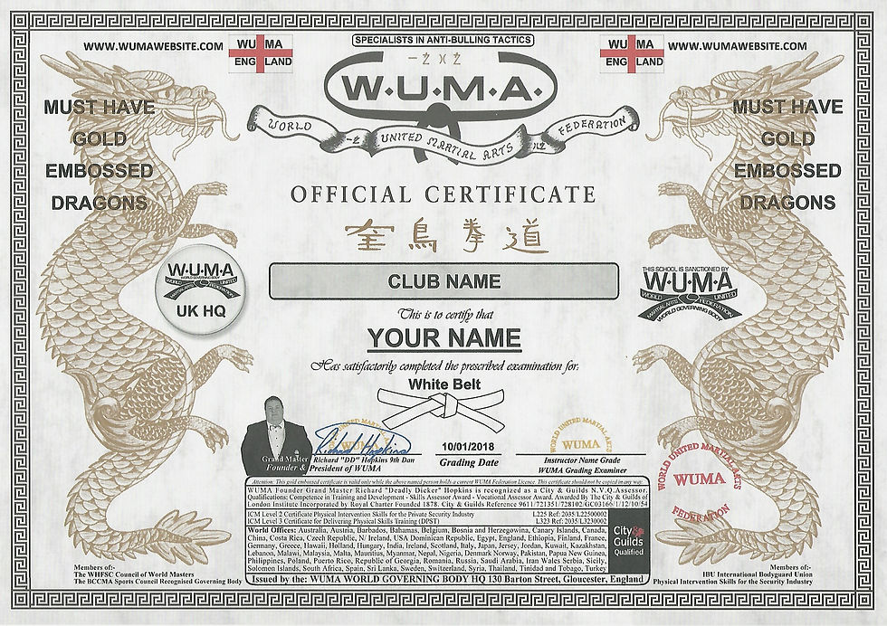 WUMA Official Certificates can easily be authenticated using the images below. Our certificates all include, two gold dragons (shown below), the WUMA stamp, Signature of our Grand Master Richard 'DD' Hopkins 9th Dan and Issued by WUMA HQ.